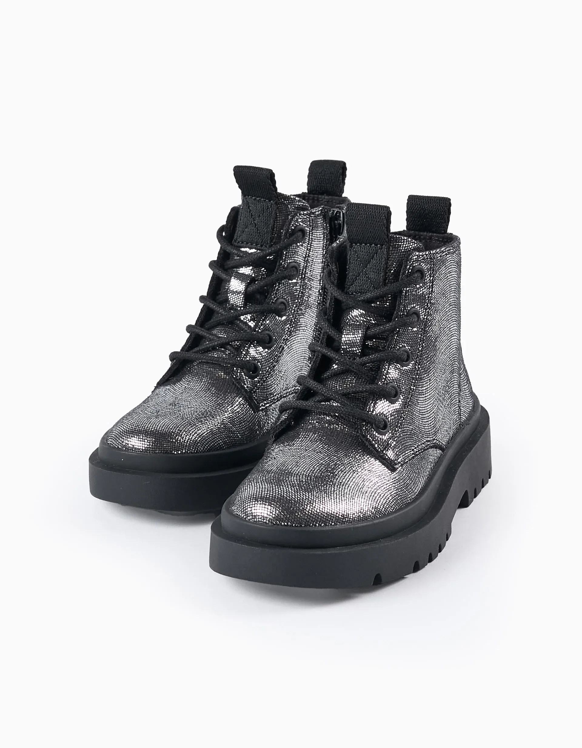 Shiny Zip-Up Boots for Girls, Silver/Black