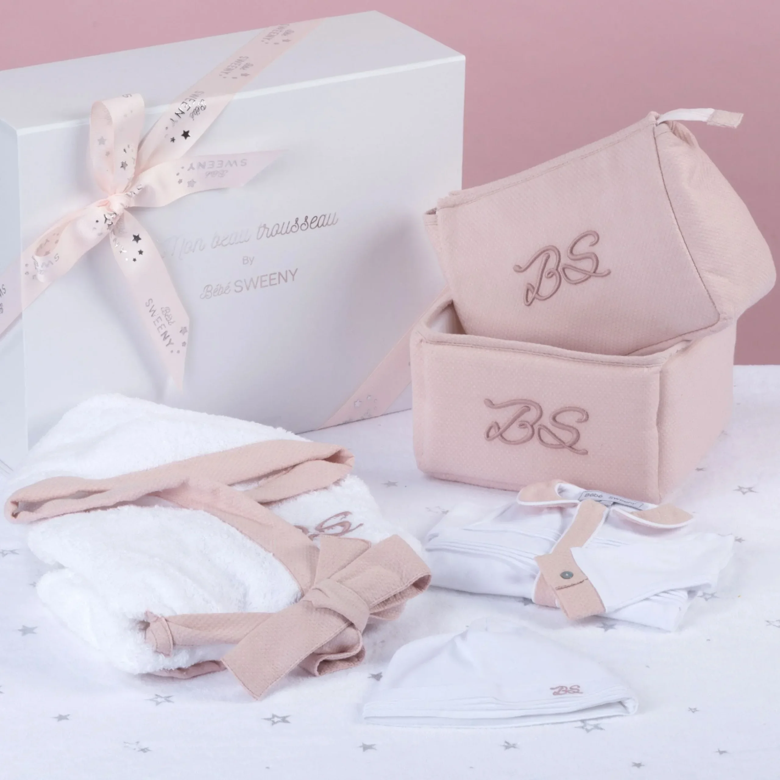 Mon Beau Trousseau Collection includes 14 items in 2 colors for baby boy and girl. Made from soft interlock, poplin and exclusive jacquard fabric, the Monogram on each item is stitched thread by thread and will make a perfect baby birth gift set.