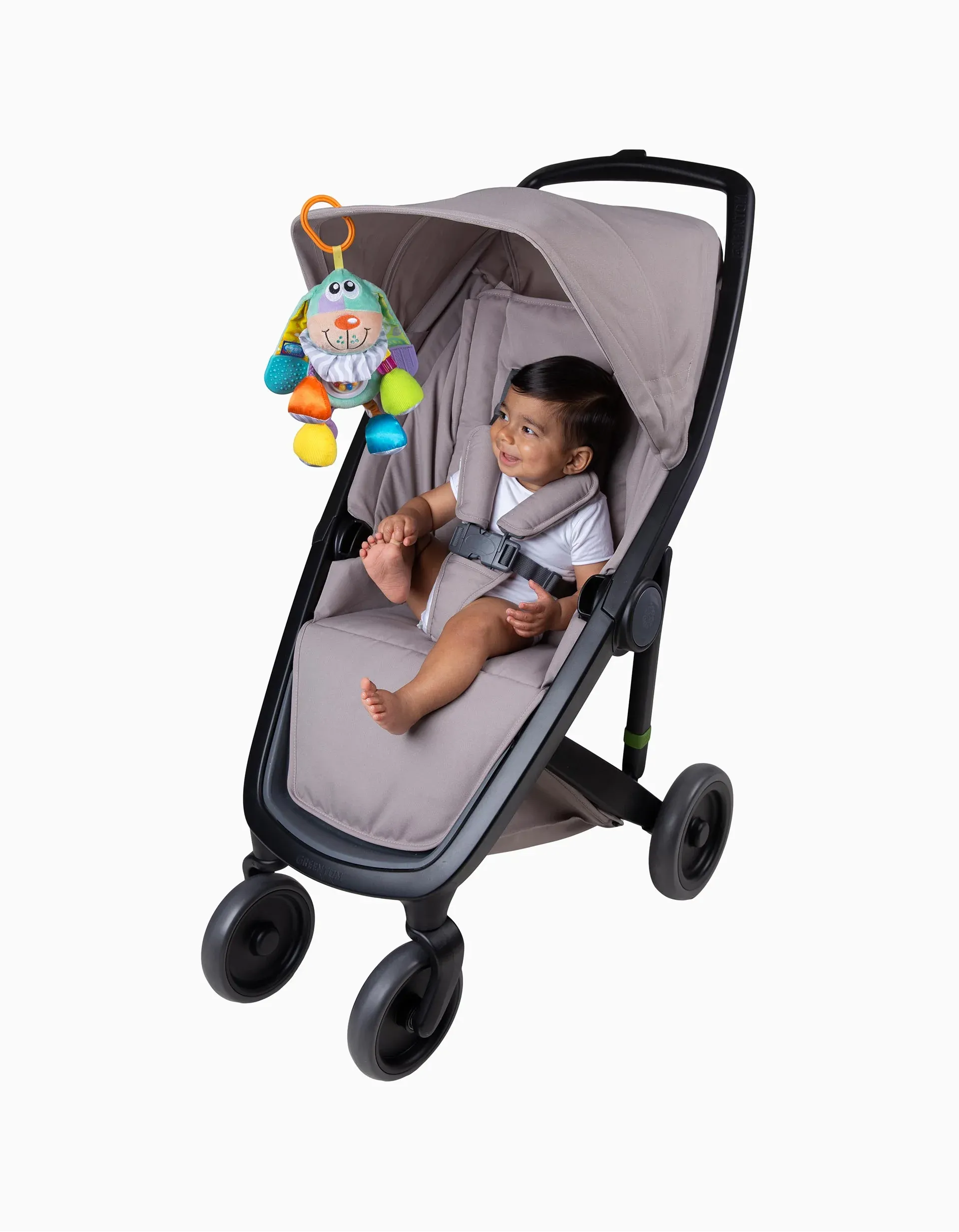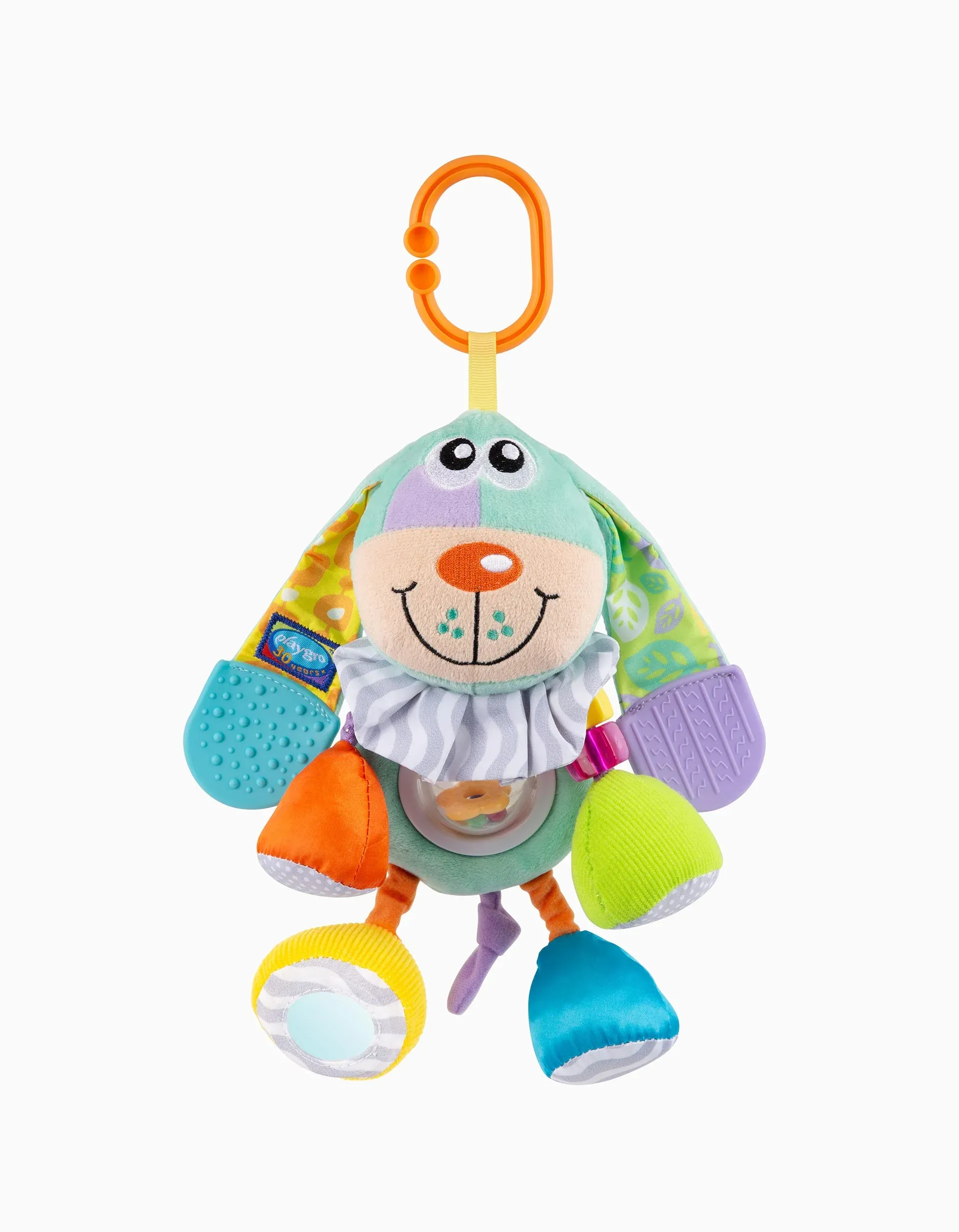 Este adorável peluche mantém o bebé entretido enquanto desenvolve as suas capacidades de aprendizagem. Este cão macio ensina ao bebé a coordenação olho-mão enquanto encoraja o desenvolvimento táctil e sensorial usando sons, formas e texturas. A atividade Doofy Dog vem com mordedor, espelho, guizo e tecido enrugado. Adapta-se facilmente à maioria dos carrinhos de bebé! Adequado desde os 3 meses.