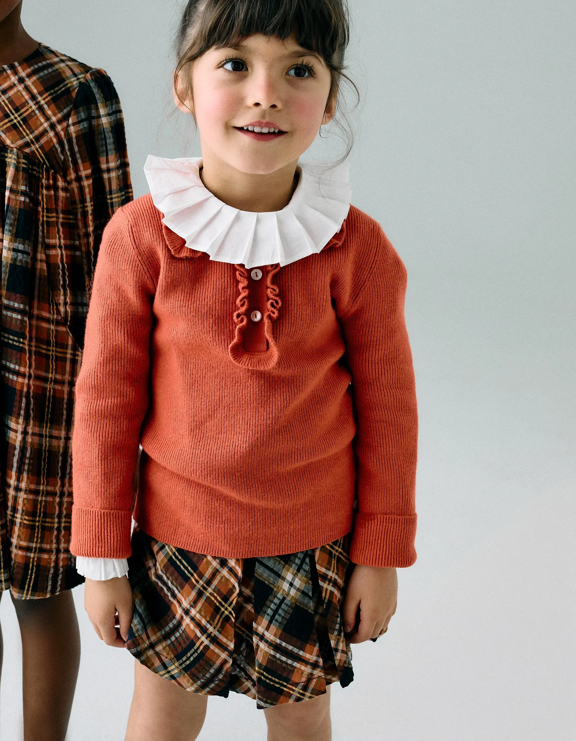 Brothers & Sisters collection. Skort for girls, in textured fabric with a check pattern in shades of orange, dark blue, and yellow. Front pleats. Fastens with a concealed zip for easy dressing. Adjustable waist on the inside with elastics and buttons. A classic and, at the same time, original garment.