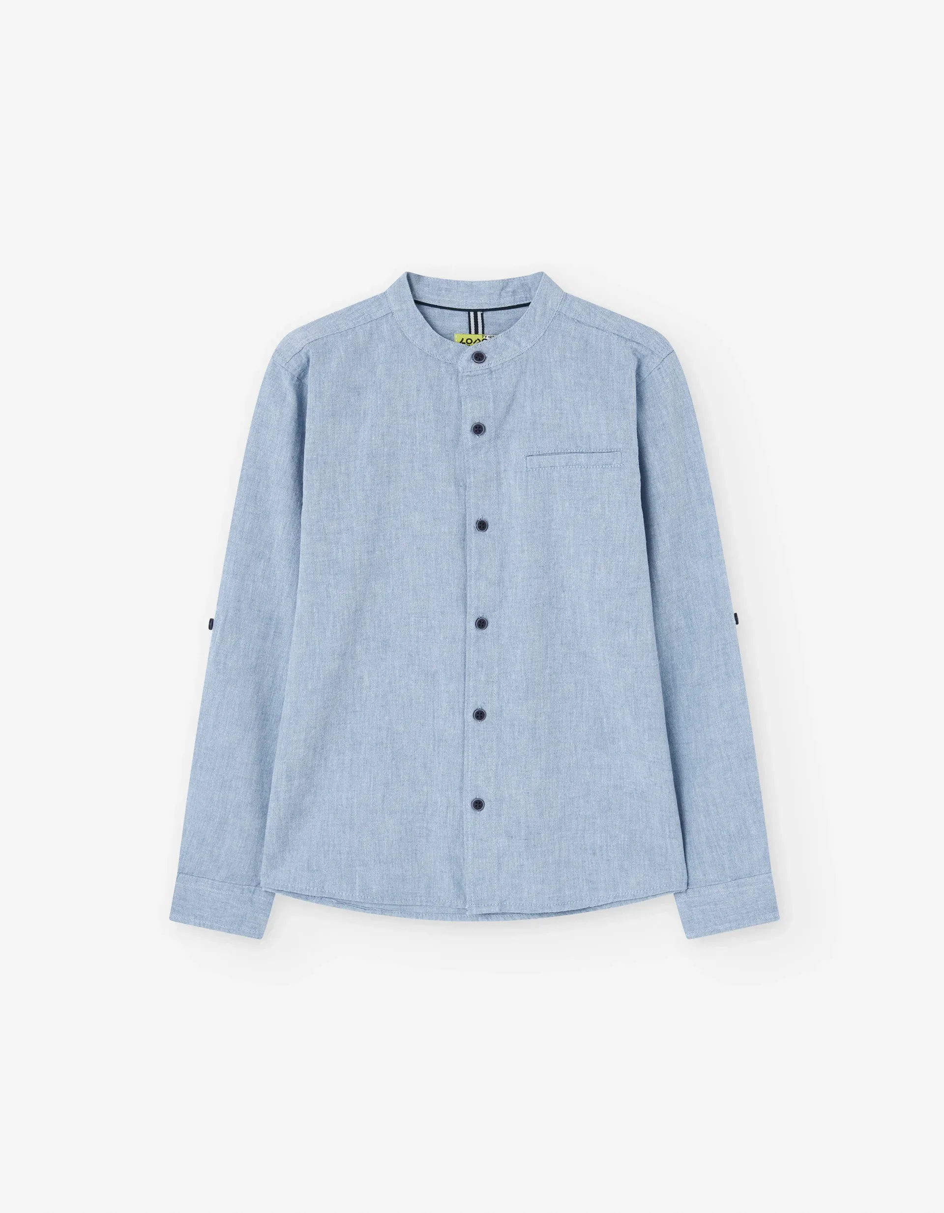 Light blue shirt for boys, made of cotton and linen, with mandarin collar. Decorative pocket on the chest. Turn-up sleeves.
