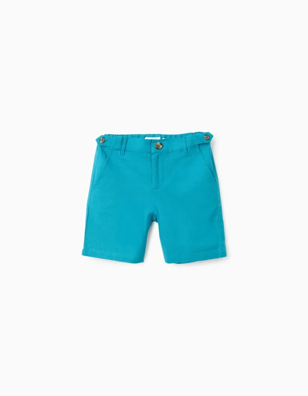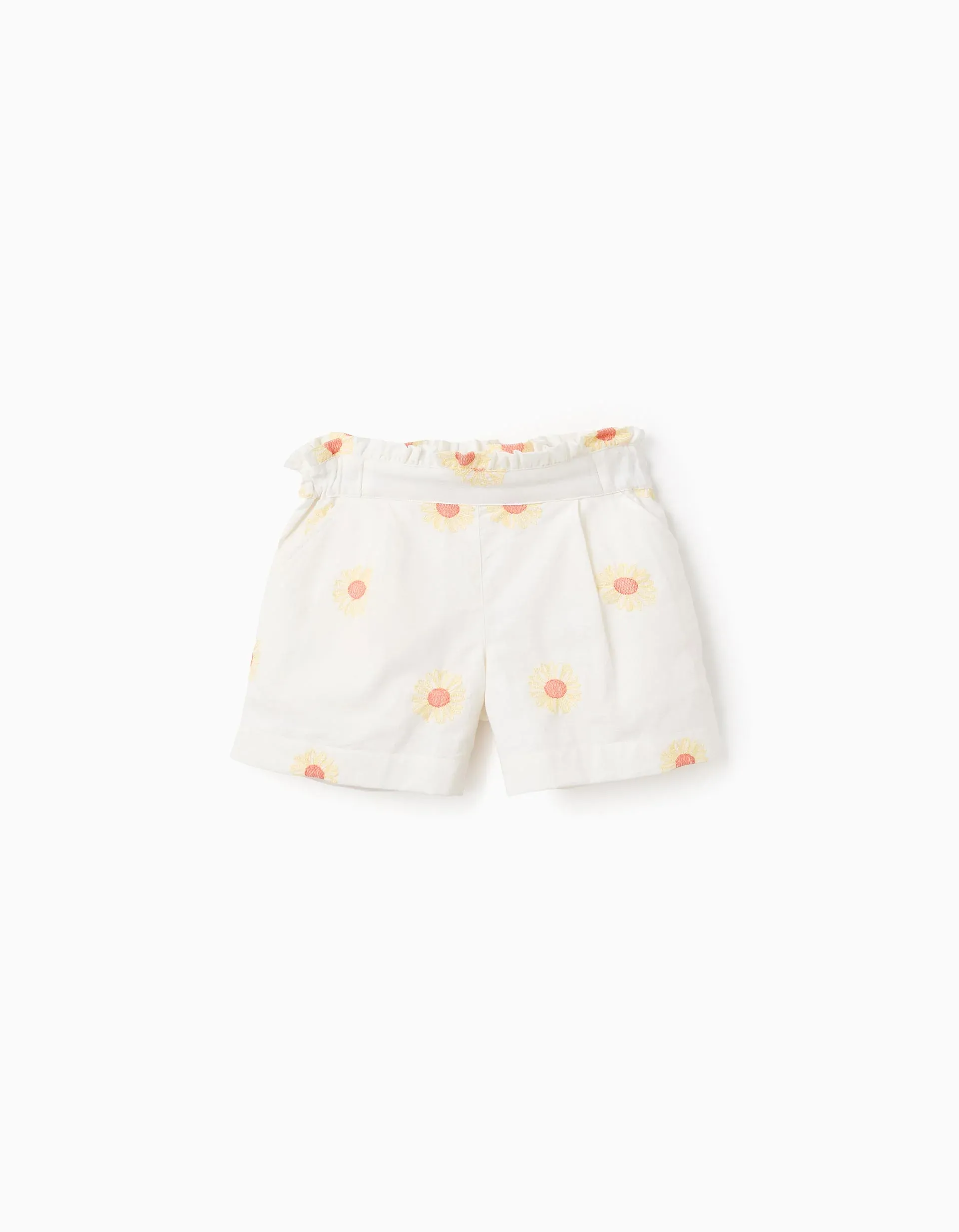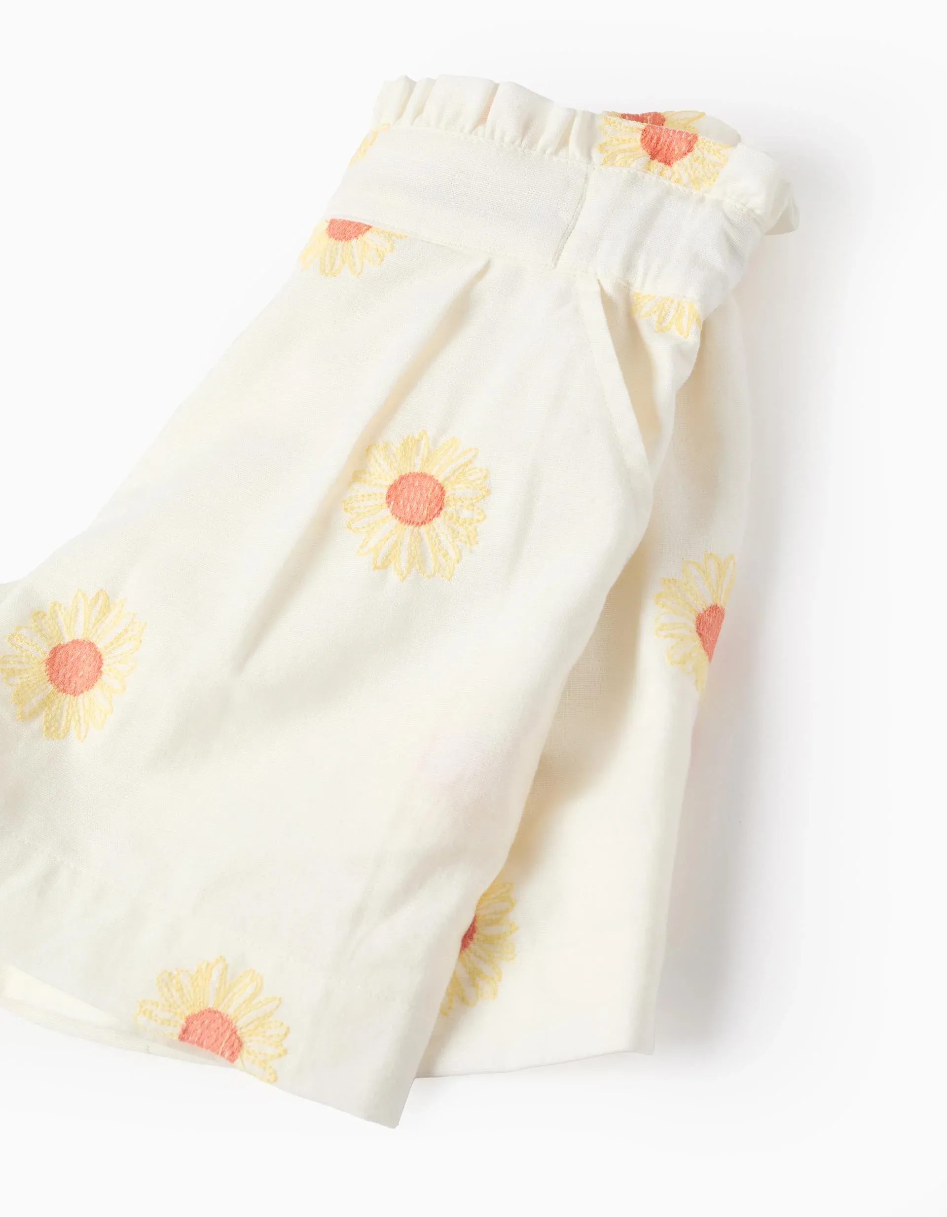 White shorts for girls, made of a cotton and linen blend. With flower embroideries in yellow and orange. Paperbag elastic waist, adjustable inside with elastics and buttons. Side pockets. With lining for maximum comfort. An original choice!