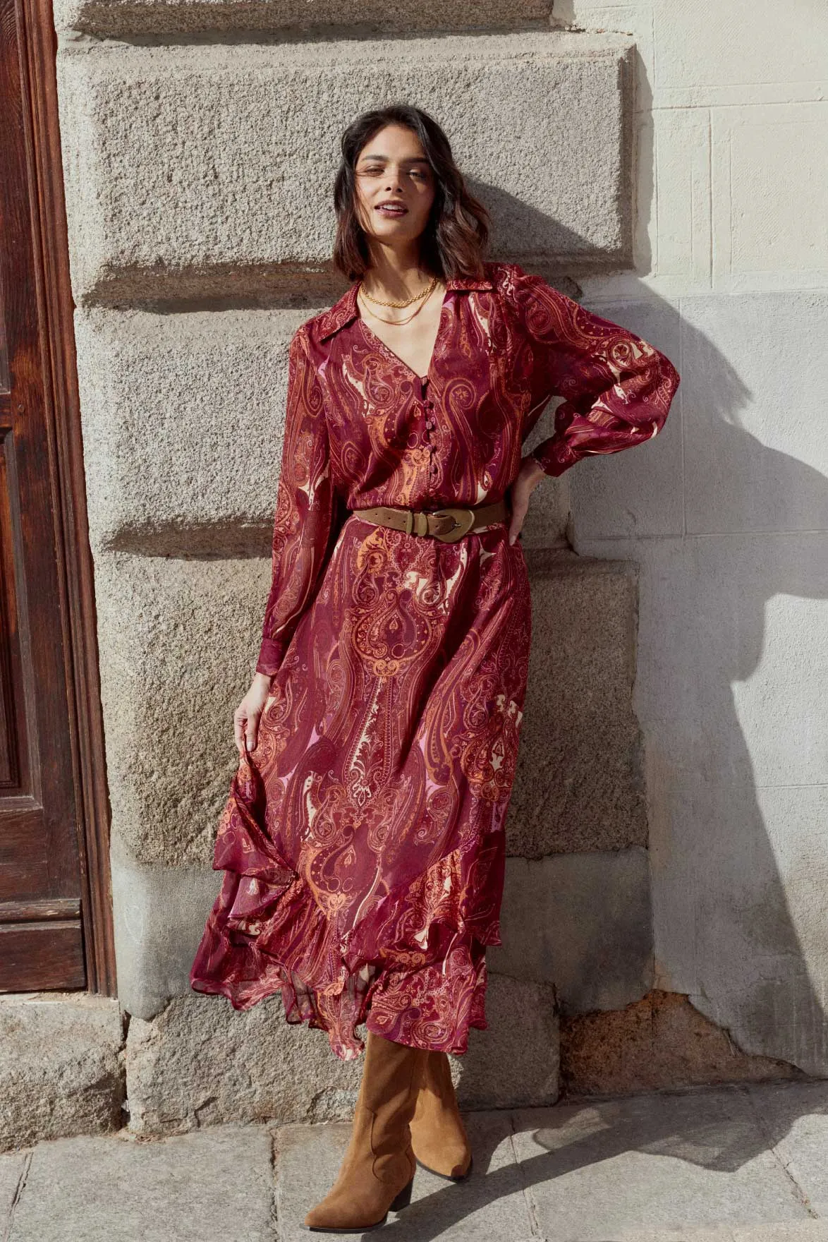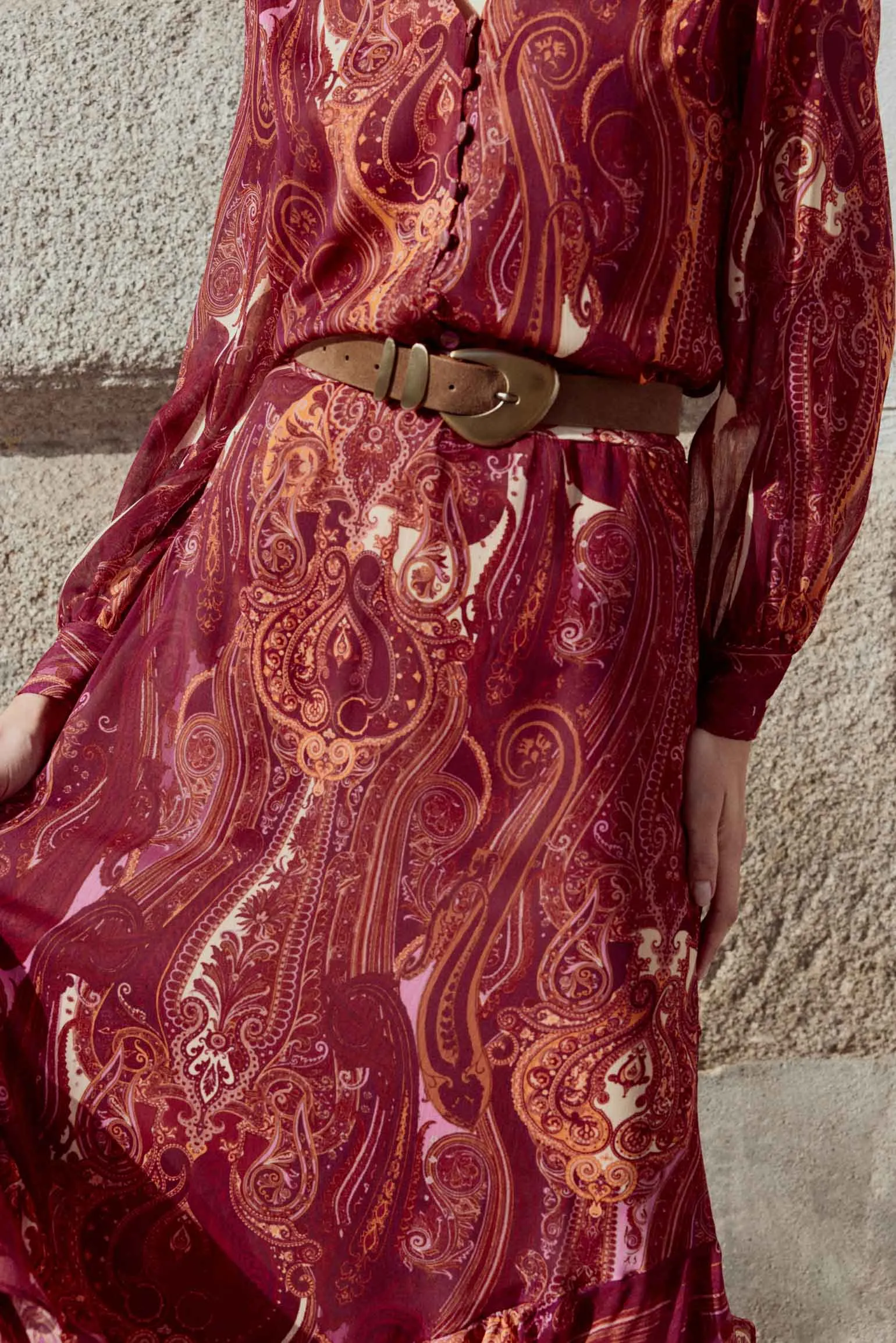 Falda estampada. Largo tobillero, de corte evasé y tiro alto con cinturilla. Con volantes en bajo. Cremallera invisible en costado.
