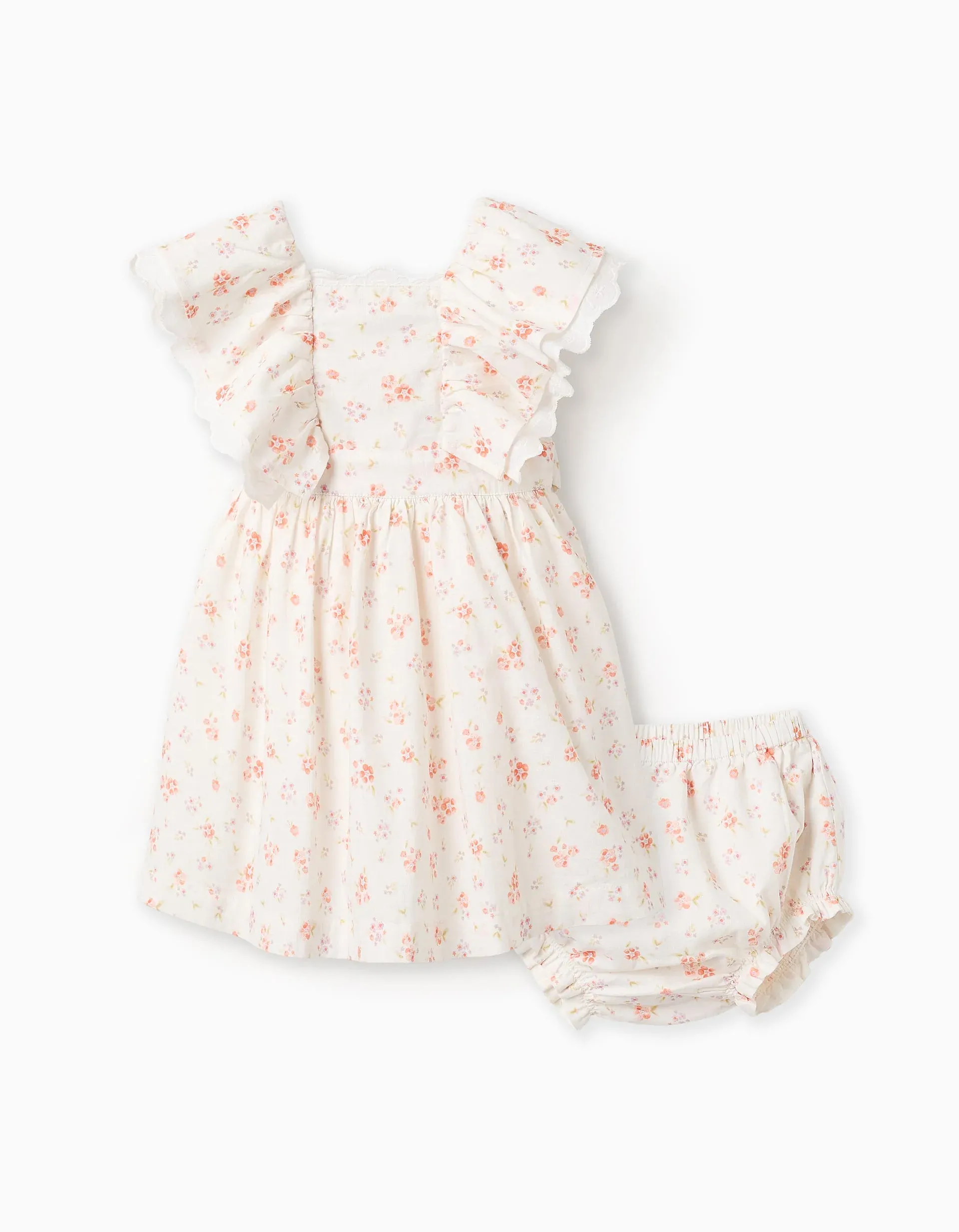 Two-piece set for baby girls, 100% cotton. It consists of an elegant white dress with a floral motif in shades of coral, lilac, and green. Square neckline. Double ruffles around the shoulders, with a layer of white fabric with embroidery. Integrated waistband to tie at the back in pretty bow. Buttons at the back. It also includes matching bloomers. With lining, for greater comfort and volume. Ideal for special occasions such as parties, ceremonies, and other events!