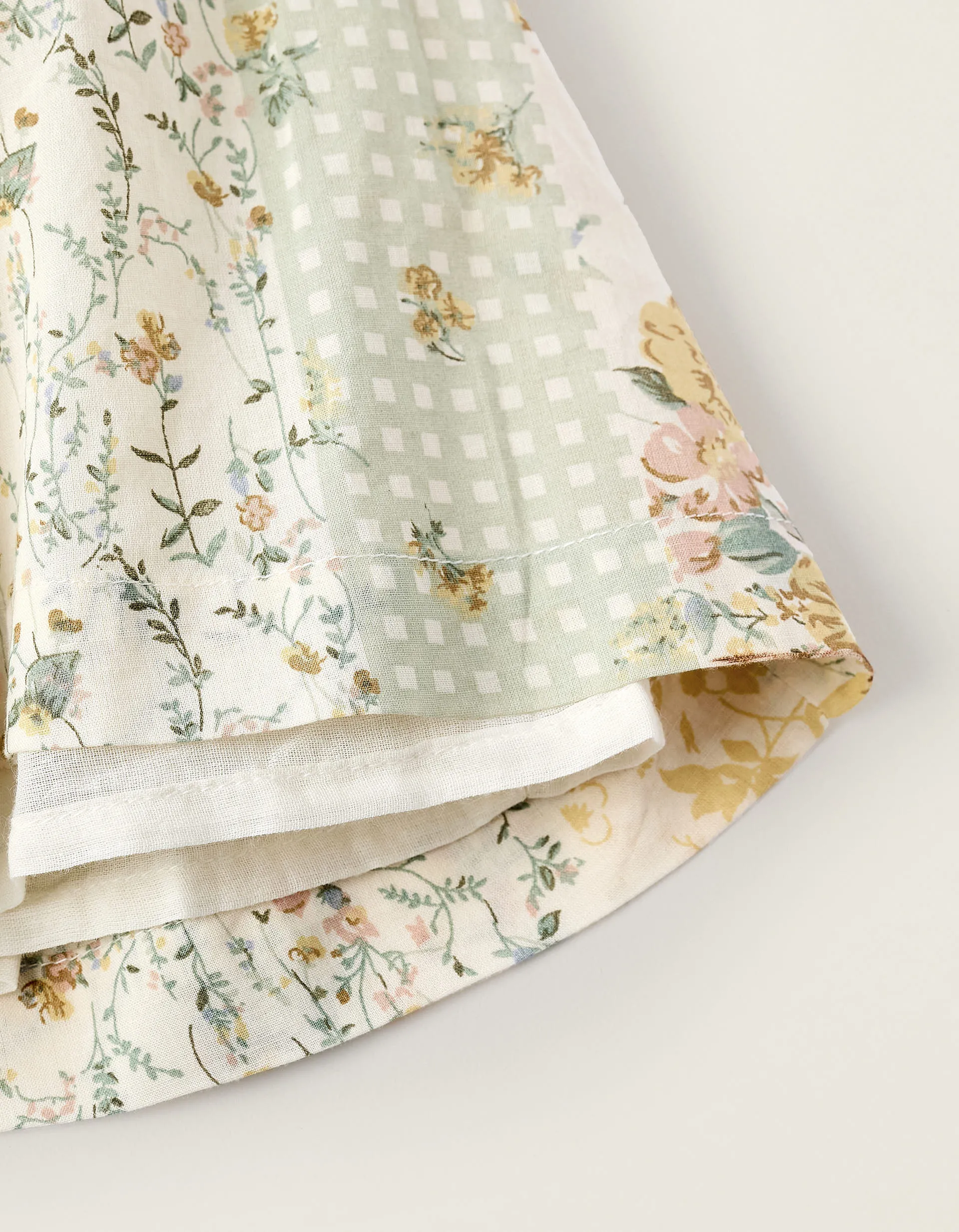 Short-sleeved dual-fabric dress for newborn girls, 100% cotton. Light pink knitted top with decorative button and wavy finish for a delicate touch. Openwork knit detail on the front. Floral skirt with lining for added volume. Fastens at the back with buttons for easy dressing. Versatile and charming, this dress is perfect for any occasion.