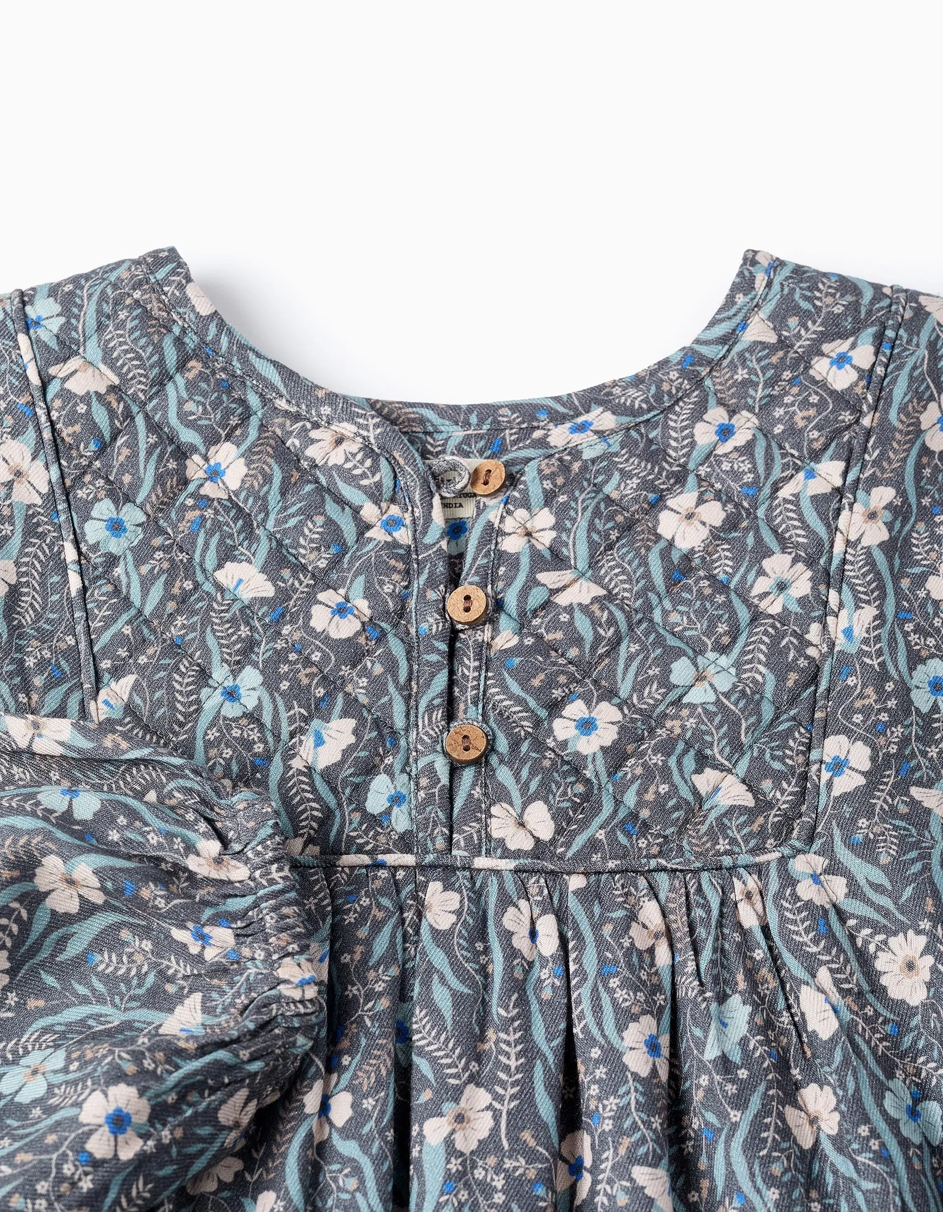 Blue long-sleeved dress for girls, with a floral pattern. Padded detail on the chest, with button opening. Puffed sleeves with elastic cuffs. A-line fit dress with gathering and ruffles. 100% cotton lining. A soft, comfortable and original dress, with a boho-chic style.