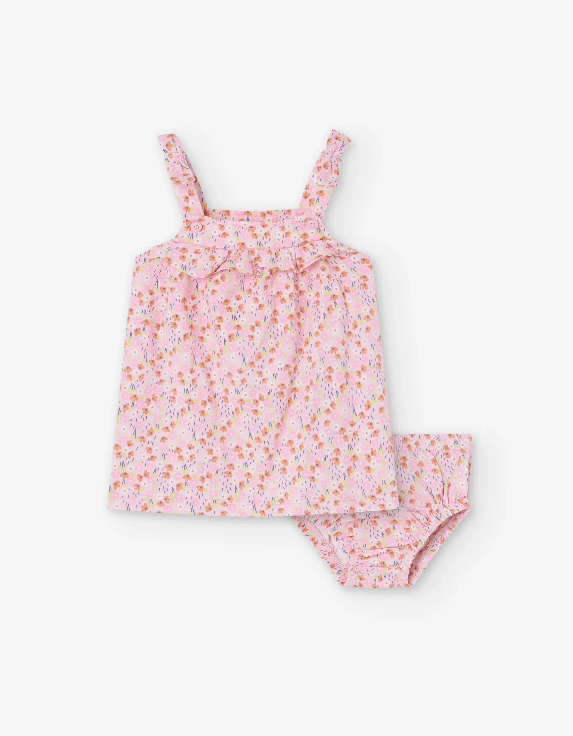 Two-piece set for newborn girls, in multicolour floral jersey. It includes a strappy dress with frills on the chest; and matching bloomers.