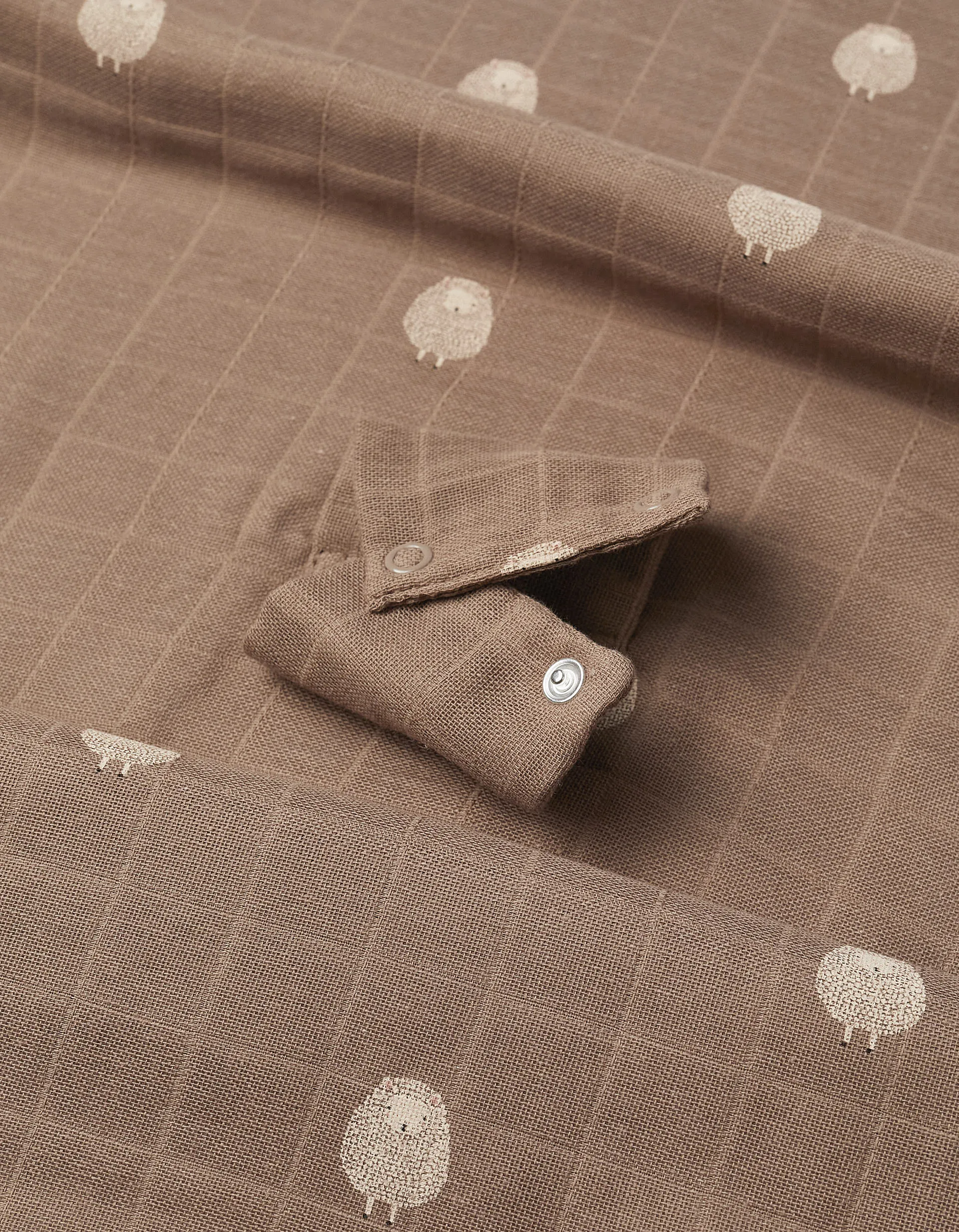 Brown car seat protector from the brand Gloop!, with a sheep motif. It protects the baby from the wind and sun during outings. The snap fasteners hold the protector to the stroller frame, preventing it from moving. Made with 100% organic cotton fabric. Manufactured in Portugal. Dimensions: 100x100cm.