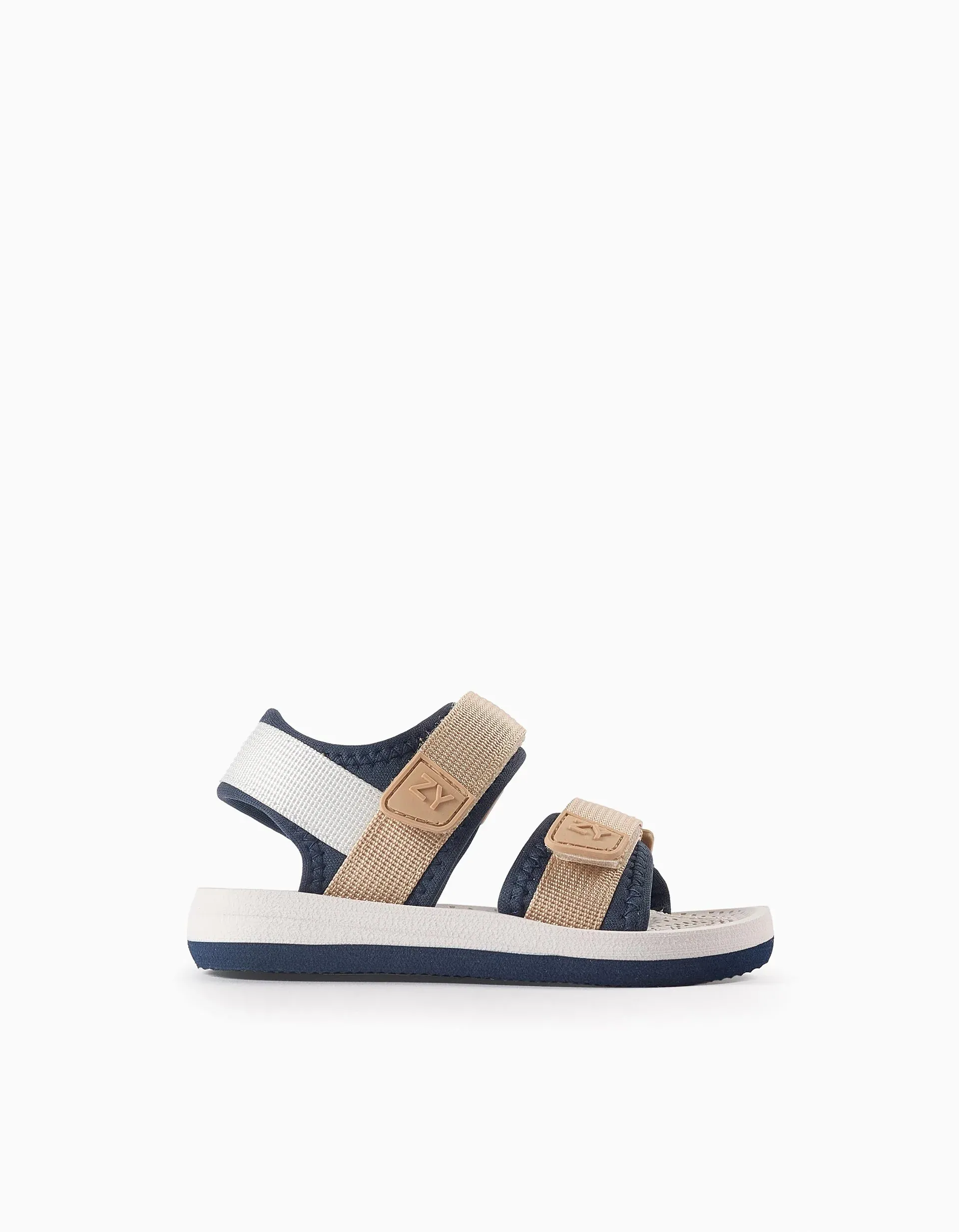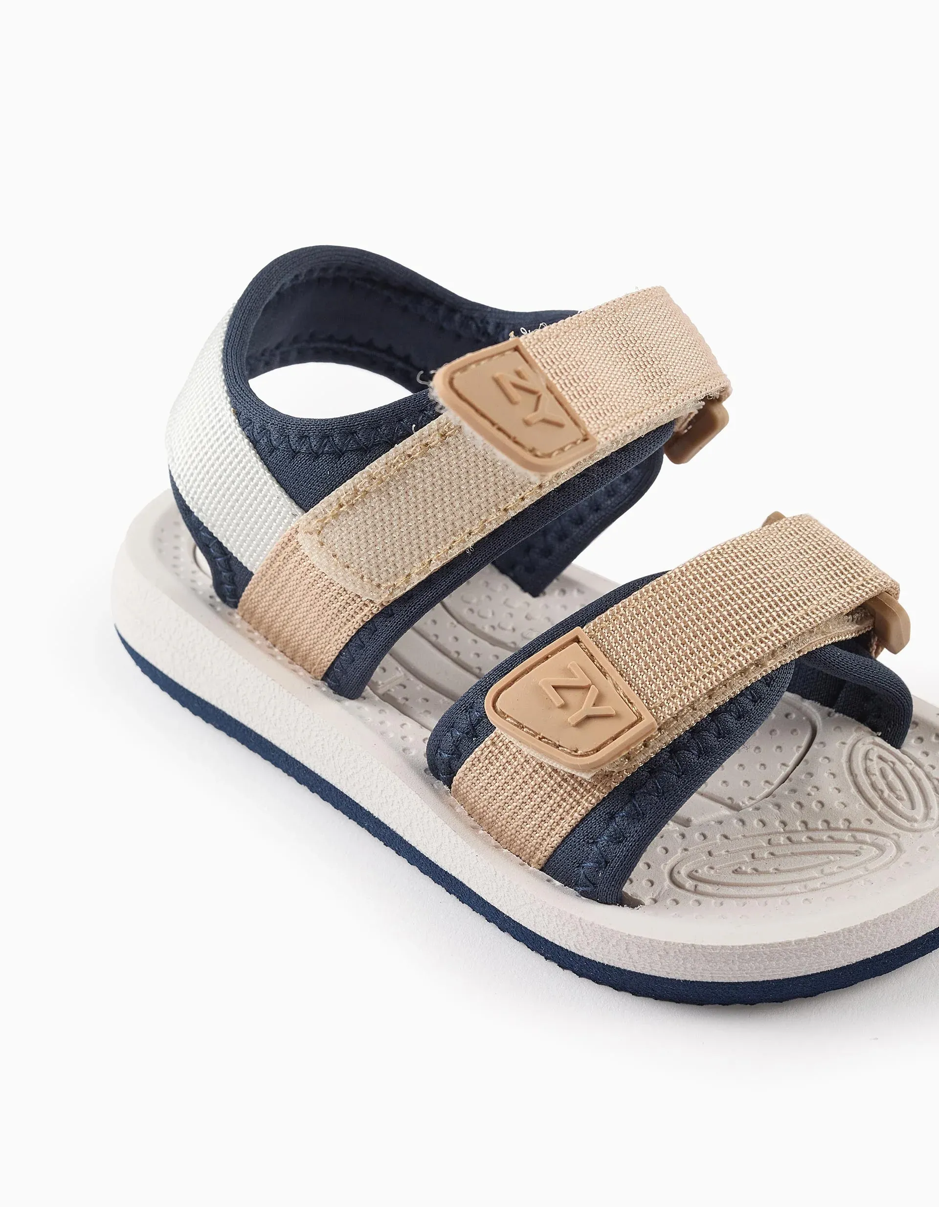 Beige and dark blue sandals for baby boys: lightweight, practical and comfortable. Fastens with touch fastener straps so they are easy to put on and adjust. Ultra-light and non-slip sole. Easily washable. The ideal footwear for summer playtime!