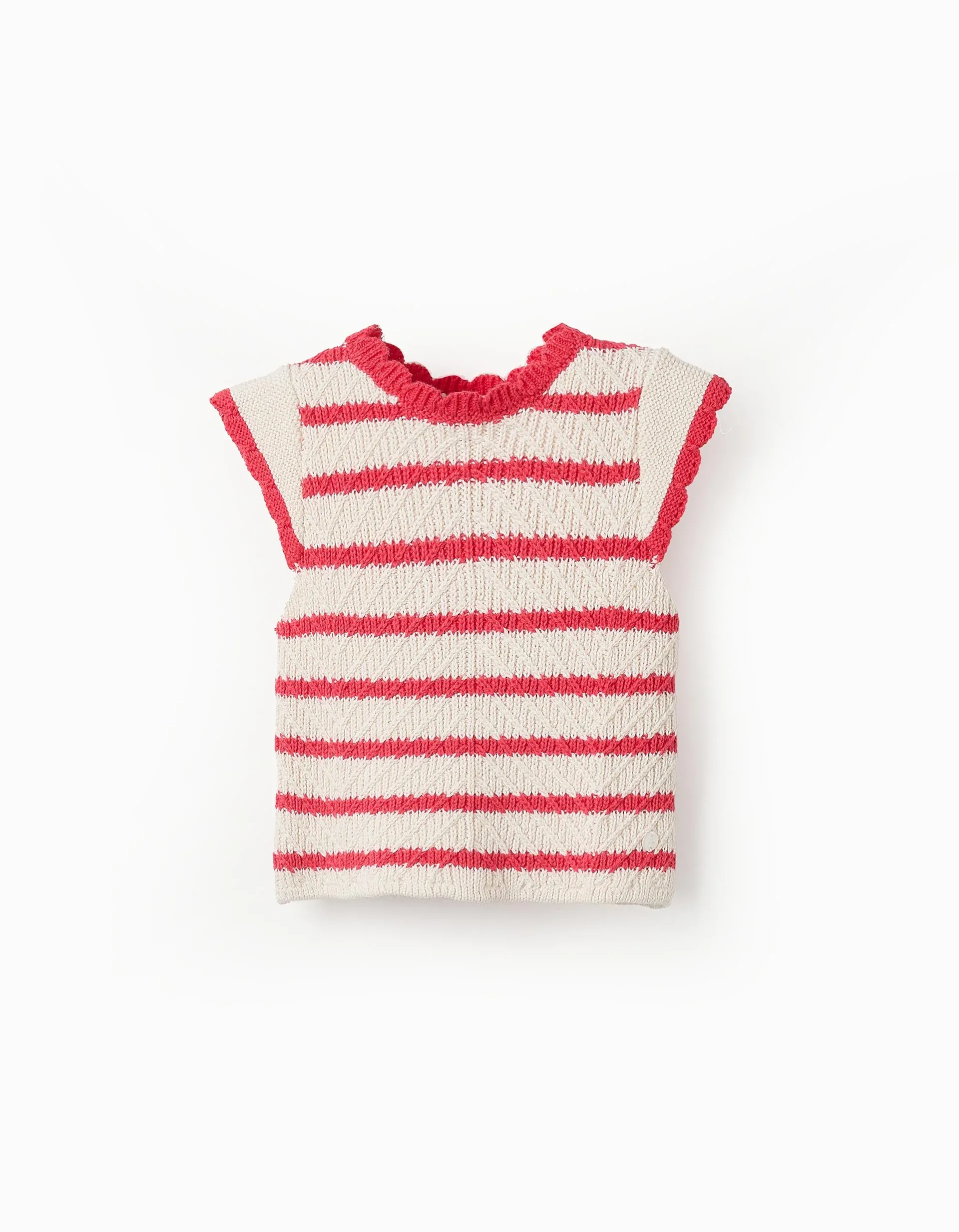 Knitted T-shirt for baby girls, 100% cotton, with white and red stripes. Sleeves with fancy trim. An adorable and original piece!
