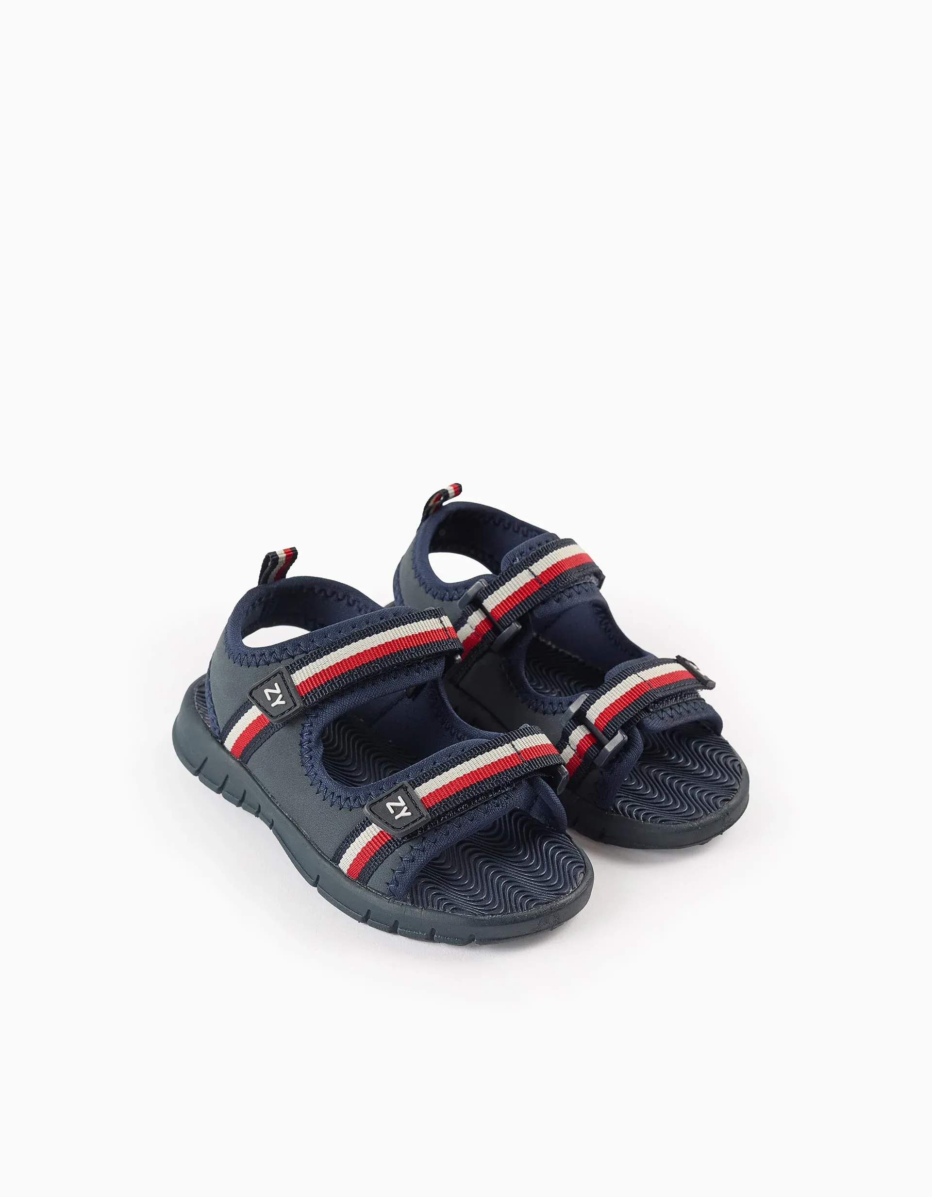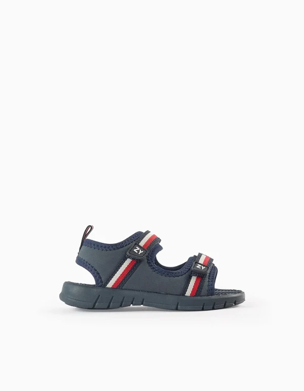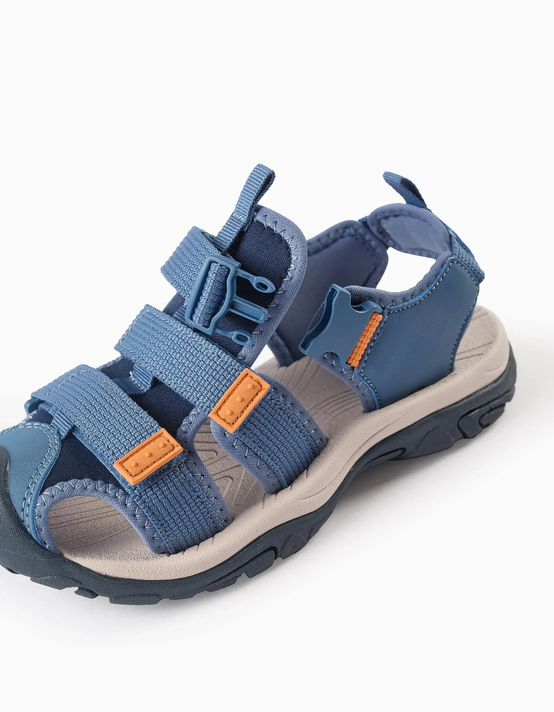 Ultralight sandals with toe cap for boys, blue with contrasting details in orange. Fastens with a snap strap and two touch fastener straps so they are easy to put on and adjust. Ultralight and non-slip sole. Practical, comfortable sandals, ideal for any outdoor activity!