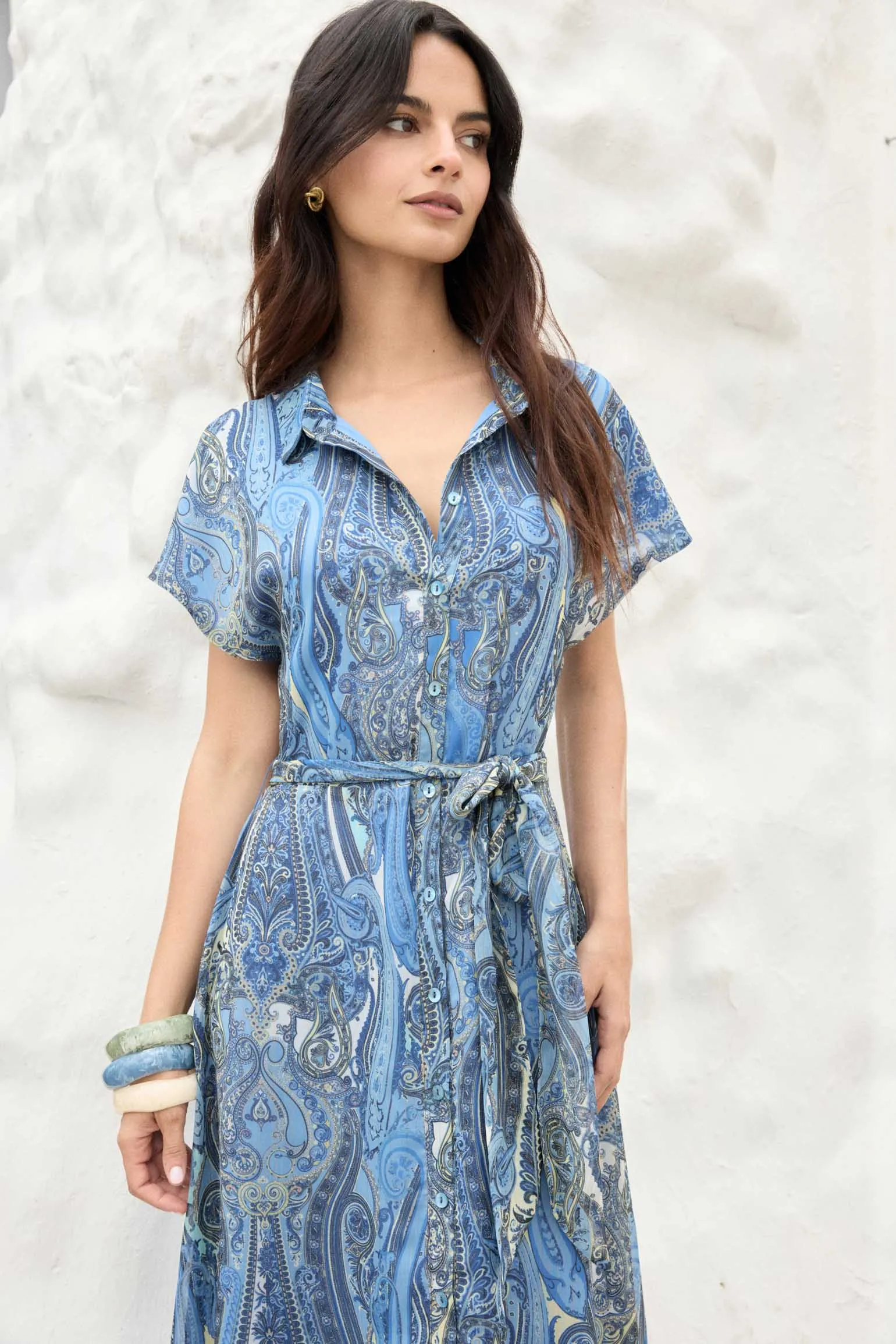 Vestido camisero de estampado paisley. De corte recto y largo midi. Con manga corta japonesa. Cierre mediante botonadura central con cuello camisa Y cinturón extraÃble para ajustar en cintura.