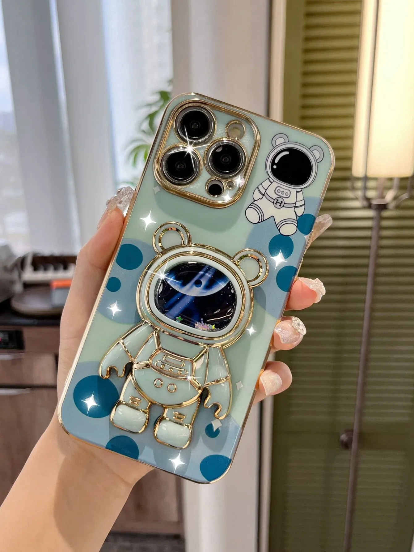 Electroplated Phone Case with Cute Bear Design & Hidden Phone Grip